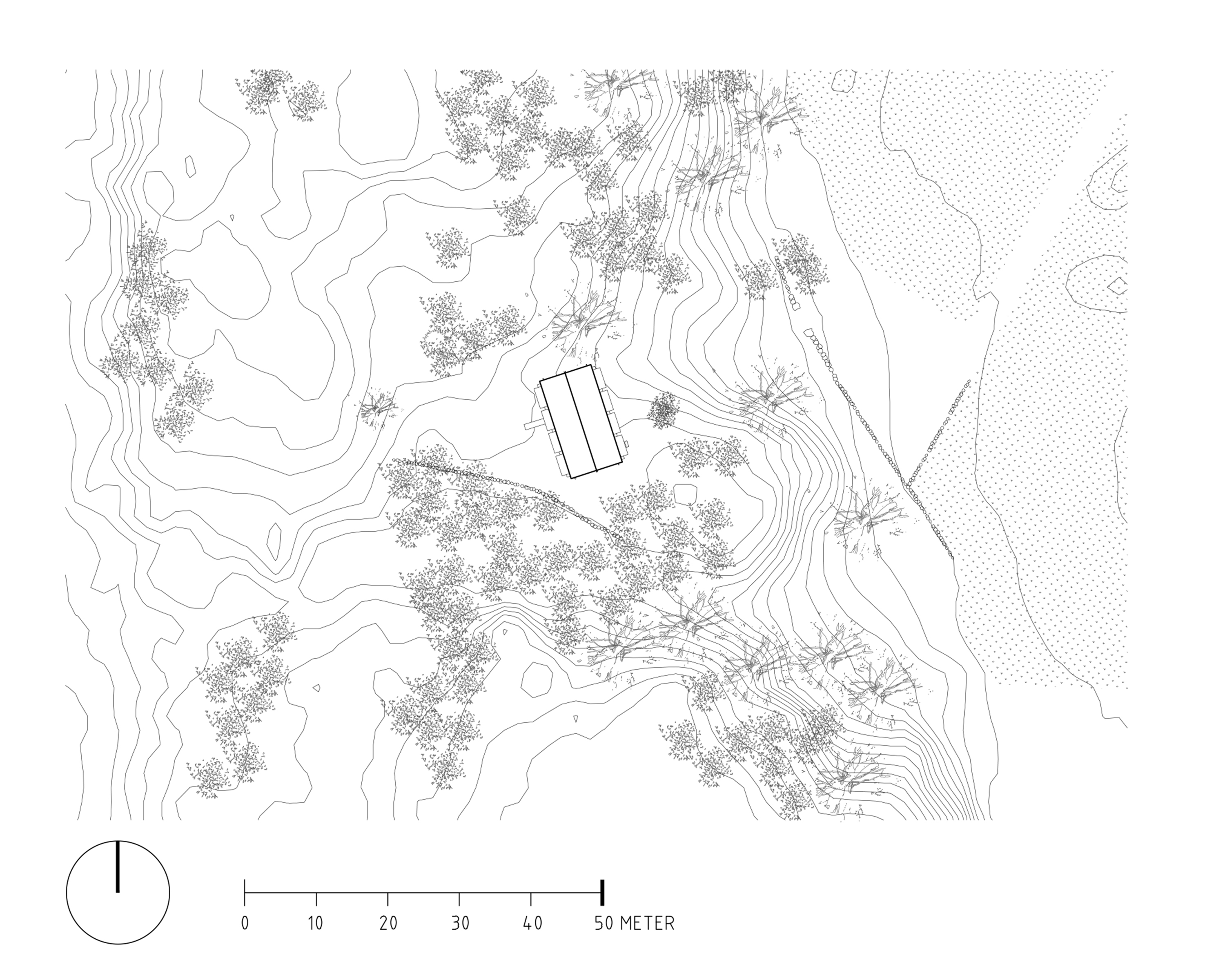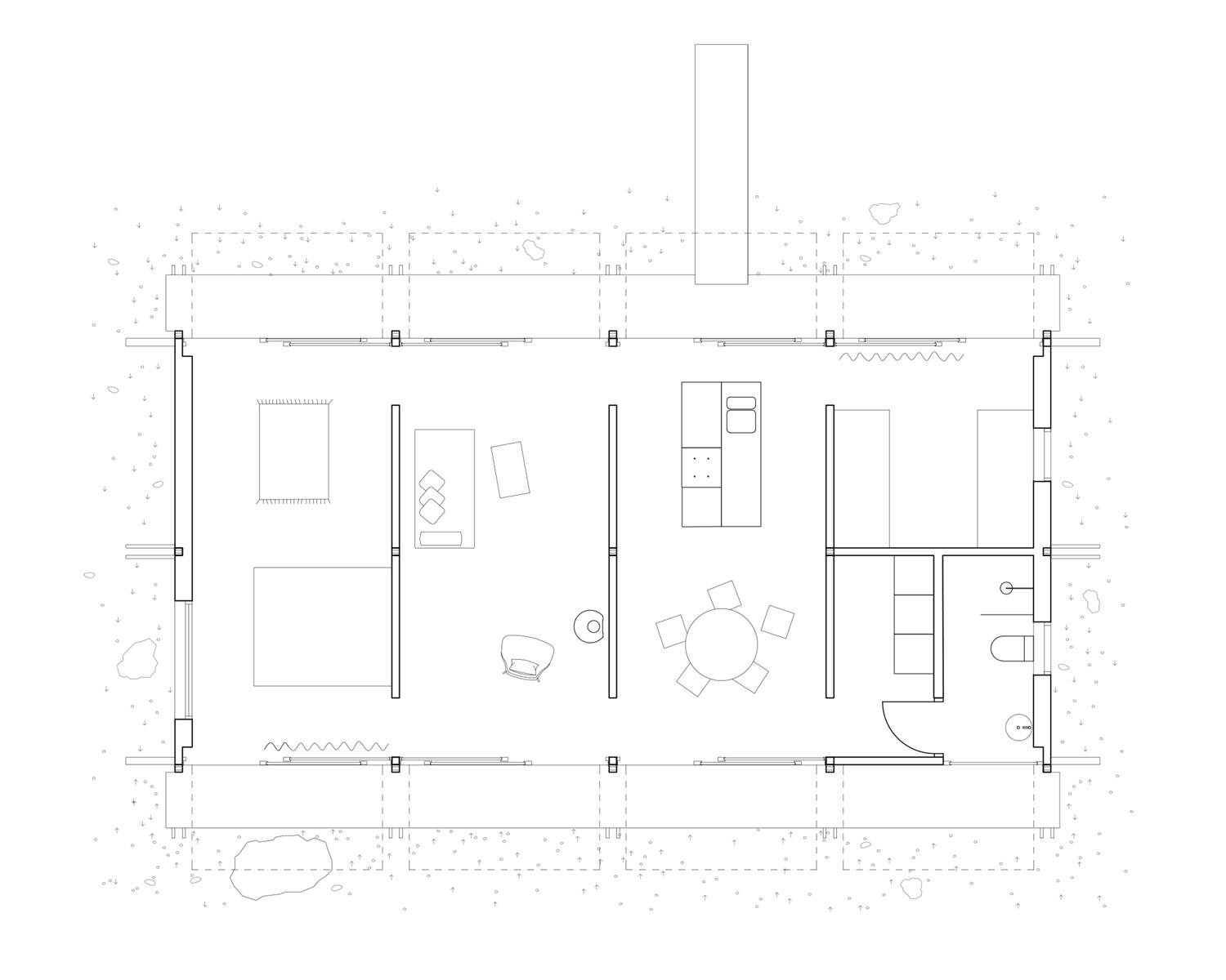 terrain. A wooden structure is raised on plinths, directly anchored in the rock. Glulam posts placed on a regular distance, form room division and module dimensions of the house. The generic plan enhances focus on basic spatial qualities and the uniqueness of the